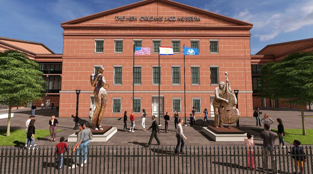 The centerpiece is the Education Courtyard, envisioned as a multifunctional space that will include seating, shaded landscaping, interpretive installations and sculptural elements that reflect the museum’s mission. According to Greg: “the courtyard is conceived as a venue for workshops, lectures, pop-up performances, community festivals, and spontaneous interaction. A place where students, scholars, locals, and visitors can mix and mingle around New Orleans’ musical spirit.” Anchoring the courtyard—as a symbol of the intersection of art, education, and musical legacy—will be two sculptures entitled The Bass Player and Trumpet Man, created by legendary musician and artist Herb Alpert.