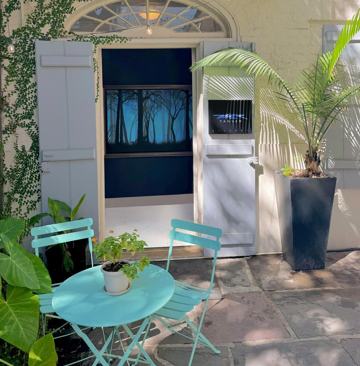 Step into Tanner Gallery & Studio at 625 Royal St. and you are immediately drawn into an atmosphere that feels elemental. Inside the carriageway that once was home to a family in the late 1700s, the air moves like sunlight through leaves, steady and alive. Canvases lean against old brick walls, brushes rest in jars like bouquets, and light settles across scenes of dark cypress trees, Spanish moss and the ironwork silhouettes of the French Quarter.