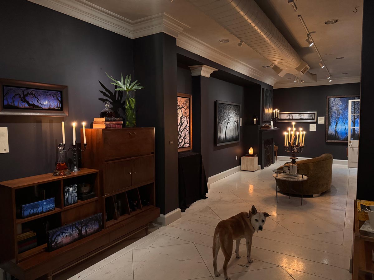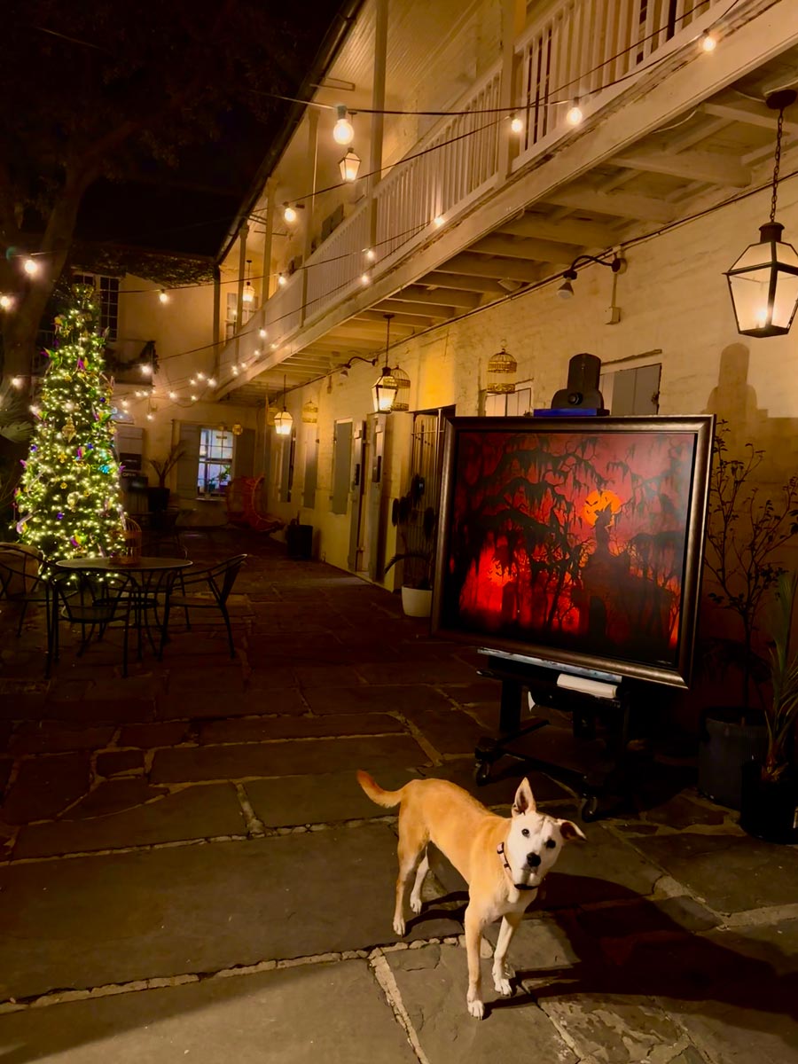 The man behind it all, artist Tanner, works in near constant motion. Visitors often find him painting with sweeping brushstrokes, his dog Loretta resting nearby. Music hums softly in the background as the world he envisions takes shape through color and texture. “The French Quarter has its own presence,” he says. “You see peaks of nature growing between centuries-old buildings, and it all feels connected.”