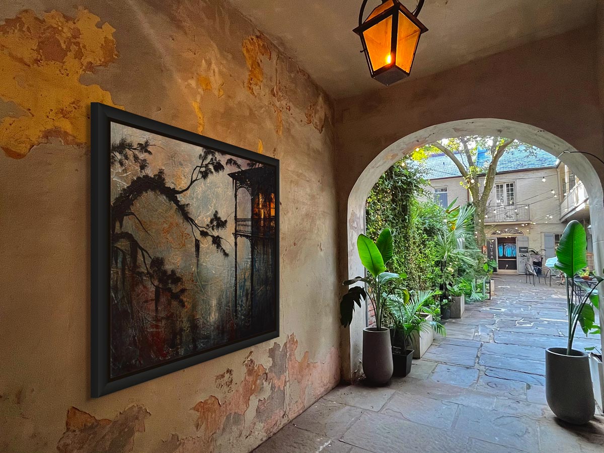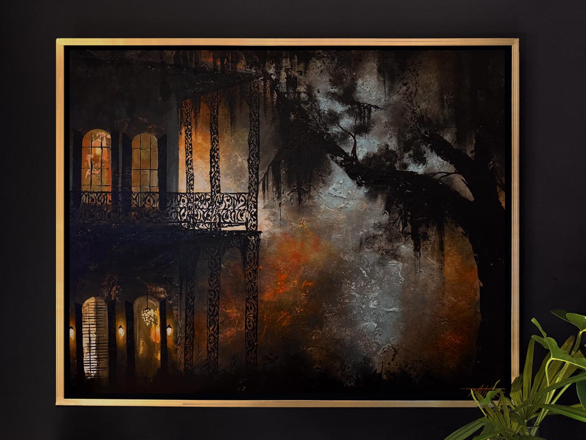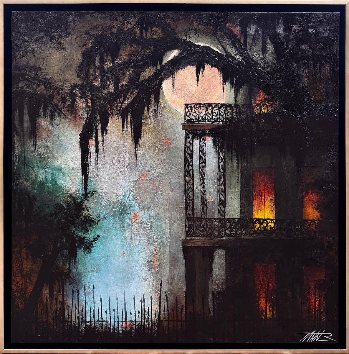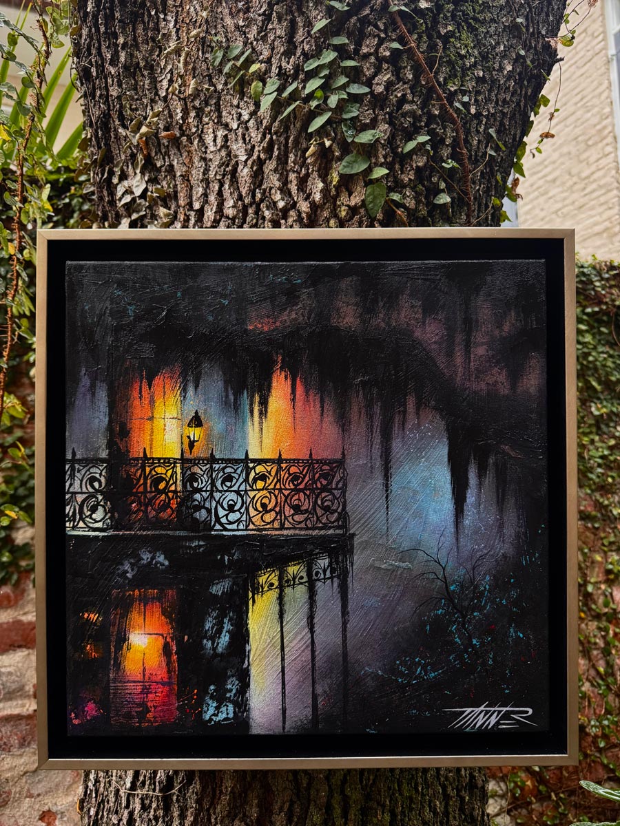 That connection, a mix of warmth, mystery and motion, defines Tanner’s art. His canvases capture the soul of Louisiana through timelessness, texture, and atmosphere. The glow behind the trees, the shimmer of iron balconies against the sky, the sense of something sacred within the ordinary. “I don’t paint from photos,” he says. “I don’t paint from memory either. I’m not sure where it comes from, since I’ve never actually been in the spaces I create, but I feel them within, and they come into existence as I add more layers.”