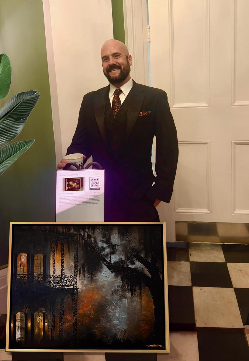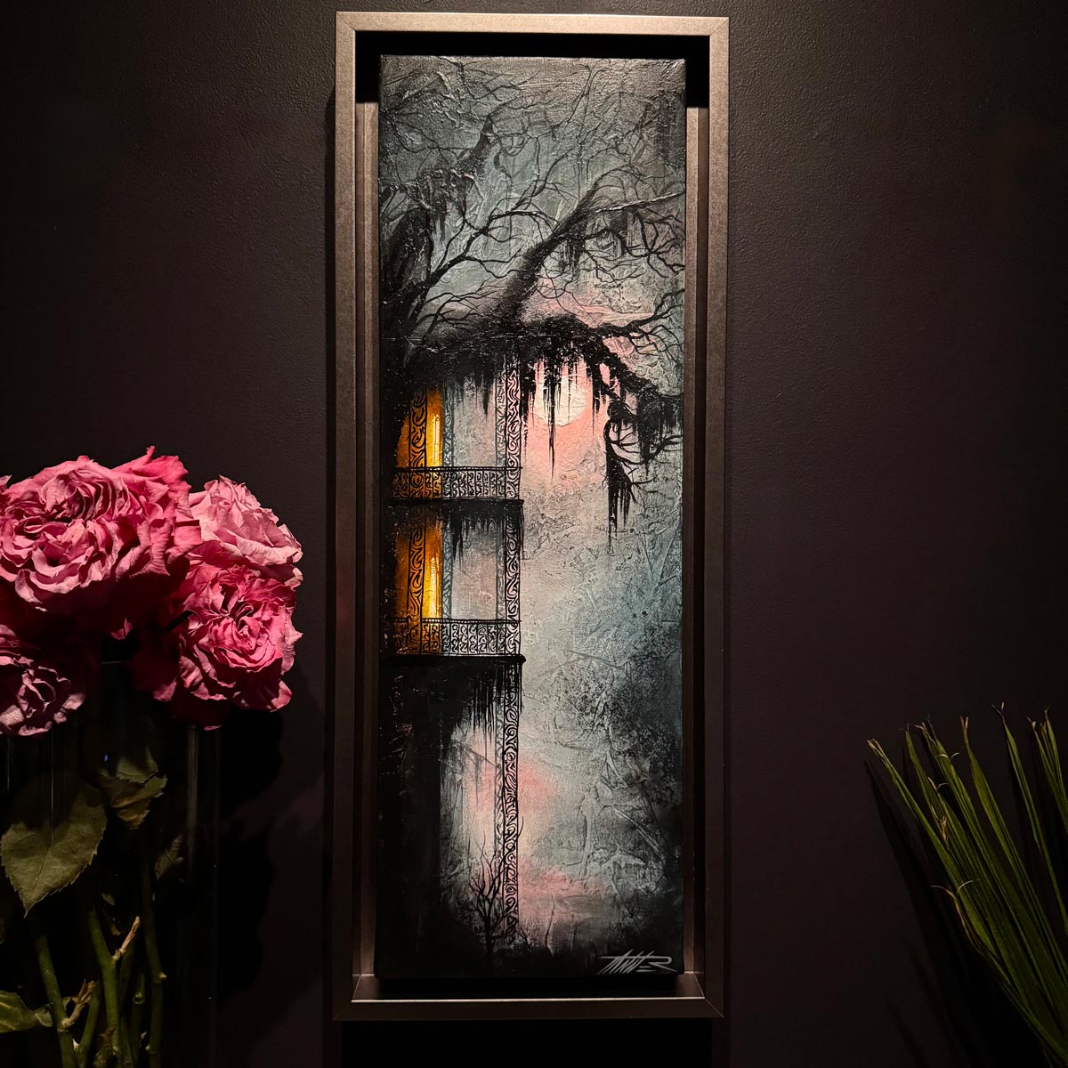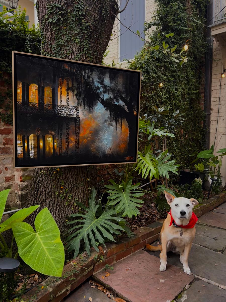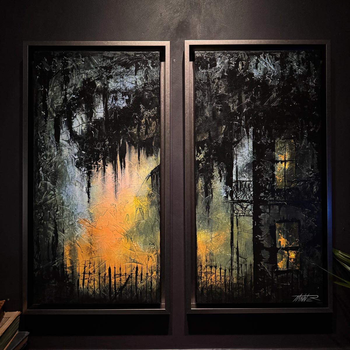 That connection, a mix of warmth, mystery and motion, defines Tanner’s art. His canvases capture the soul of Louisiana through timelessness, texture, and atmosphere. The glow behind the trees, the shimmer of iron balconies against the sky, the sense of something sacred within the ordinary. “I don’t paint from photos,” he says. “I don’t paint from memory either. I’m not sure where it comes from, since I’ve never actually been in the spaces I create, but I feel them within, and they come into existence as I add more layers.”